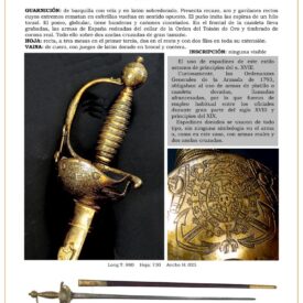 | Guarnición | Totalmente en latón sobredorado. Puño cuadrado en disminución hacia la hoja y finamente decorado con delicados cincelados. Pequeña virola y pomo rematado en botón. Gavilanes rectos, que se van ampliando y terminan en flor de lis. En el centro de la cruz, en ambos lados, un rectángulo cuadrillado para impedir el deslizamiento del dedo pulgar. |