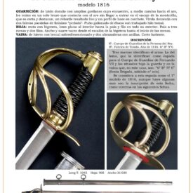 | Guarnición | Latón dorado, pomo con cabeza de león y anilla, puño con escamas, gavilanes rectos con remates en forma de flor de lis, escudo con iniciales «GR» y cifra regimental «2°Rº». |