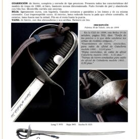 | Guarnición | Cazoleta en metal blanco con calados a base de motivos vegetales, monterilla en cabeza de león, y puño de madera forrado de lija. |